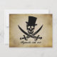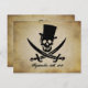 Un clásico Jolly Roger, con sombrero de copa opcional, en un fondo con aspecto de antigüedad desgastada y espacio para todos los detalles de tu invitación en lenguaje pirata.