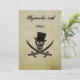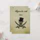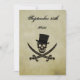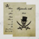 Un clásico Jolly Roger, con sombrero de copa opcional, y espadas cruzadas de Rackham sobre un fondo con aspecto de antigüedad grunge y espacio para todos los detalles de tu invitación personalizada en habla pirata.