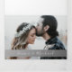 Invitación de boda simple, elegante, con guion de caligrafía moderna plateado-gris negro y blanco, con foto de la pareja en la parte delantera.