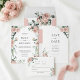 Celebra tu amor con esta invitación de boda romántica de rosa rubor. Cuenta con una exuberante frontera de flores rosadas de acuarela y elementos botánicos de eucalipto verde suave contra un fondo blanco limpio. Este diseño es ideal para parejas que planean una boda de jardín de verano sin tiempo o una ceremonia al aire libre elegante entre las flores.