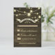 tarjetas de confirmación de boda rústica de campo con fondo de madera desgastada, luces de cadena brillantes y tipografía elegante con un banner.