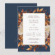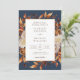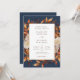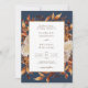 Invitación de boda de hojas de otoño en terracota azul marino. Esta elegante invitación de boda presenta hermosas hojas de terracota, cobre y naranja quemada pintadas a mano en acuarela, dahlias crema y beige, y hermosas rosas herrumbre y marrón sobre un fondo azul marino, ¡perfecto para una boda de otoño! La parte posterior de la invitación tiene una hermosa rama con hojas con el monograma de la novia y el novio. Encuentre artículos coincidentes en la colección Navy Blue Autumn Romance Wedding.