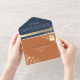 Capture la esencia del romance moderno con nuestra invitación de boda todo en uno de terracota y azul marino. Este elegante diseño presenta encantadores pájaros de amor ubicados en medio de encaje floral dorado falso, lo que agrega un toque de fantasía a su día especial. Personalícela con una foto personalizada de la pareja en la parte posterior, junto con los detalles de la boda y la información de RSVP. Establezca el tono para su celebración con esta sofisticada invitación que combina hermosamente lo rústico y lo chic con una elegancia atemporal.