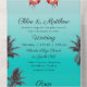 Un diseño de tema de playa tropical y brillante inspirado en una isla con aguas cristalinas. Hay una escritura elegante con fuente sans serif. Los colores de fondo son tonos de azul cielo y aqua con flamencos rosados/corales y palmeras. Este diseño alegre y moderno es ideal para bodas de playa, marina y de destino. Las fuentes son personalizables.