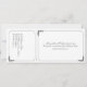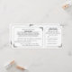 Esta invitación de boda impresa al estilo de un boleto antiguo en clásico negro y blanco también incorpora una tarjeta de respuesta RSVP desmontable. Marcos simples de esquinas redondeadas están acentuados con adornos ornamentados y vintage de hojas enrolladas. Los nombres de la Novia y el Novio junto con el encabezado de RSVP también están resaltados con decoraciones enrolladas. En el reverso, la dirección de devolución se puede agregar al RSVP y más detalles de la boda a la parte de la invitación. La línea de corte para la tarjeta de respuesta está indicada en la parte posterior de la invitación por una línea rota pálida y una imagen de tijeras.