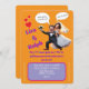 Fuera del diseño convencional, que representa a una pareja de recién casados como un estilo de dibujos animados, celebrando felizmente su momento, añadiendo elementos para hacer que la composición se vea llamativa y divertida. Tarjeta personalizable.