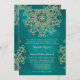 Una hermosa invitación de boda en azul verde turquesa pavo real TEAL JEWEL TONED y dorado con un patrón ornamental de sari MEDALLÓN exótico inspirado en la India con un diseño floral y de ráfaga de sol de loto. Esta elegante y hermosa invitación de boda de estilo indio moderno de lujo es perfecta para cualquier ocasión formal con un tema de ALADÍN NOCHES ÁRABES, MARROQUÍ, INDONESIO O ASIÁTICO ORIENTAL. Diseñado por Chrissy H. Studios, LLC. Todos los derechos reservados.