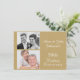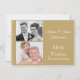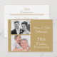 Esta invitación del 50 aniversario de bodas cuenta con un fondo de color dorado y una fina decoración similar a encaje en los lados, así como dos áreas para las fotos de la pareja. La parte trasera es blanca con una decoración dorada fina similar a encaje. Está lista para personalizar y es adecuada para un aniversario de bodas dorado de 50 años.