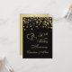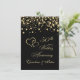 Invitación de aniversario de bodas de 50 años con corazones unidos dorados y confeti redondo sobre fondo negro