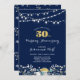 Invitación de Aniversario de Boda Navy & Gold Night Garden. Hermosa tipografía dorada, cadena de luces y corona de flores.