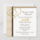 Elegante invitación de fiesta por quincuagésimo aniversario de boda en forma cuadrada, con un patrón de damasco beige y blanco, a la izquierda y dos acentos de corazón dorado. Personalice el texto marrón para su evento especial de 50 aniversario de boda.