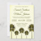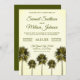 Sorprenda a sus huéspedes con esta elegante invitación a una boda tropical con hermosas palmeras altas con tipografía moderna en un entorno de pergamino vintage. Simplemente agregue los detalles de su evento en esta plantilla fácil de usar para convertirla en una invitación única.