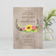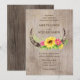 Invitación a la boda rústica de los Cuernos de toros y flores sobre un fondo de madera. El centro de los cuernos está decorado con girasoles con flores rosas y vegetación. La parte trasera de la tarjeta es de la misma madera pero en un marrón más oscuro.