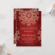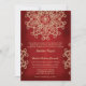 Una hermosa invitación de boda de color rojo rubí profundo y dorado con un patrón ornamental de sari exótico inspirado en la India con un diseño floral y de loto. Esta elegante y hermosa invitación de boda moderna de estilo indio es perfecta también para una fiesta de compromiso o aniversario con un tema indio, marroquí, asiático oriental o indonesio. Diseñado por Chrissy H. Studios, LLC. Todos los derechos reservados.