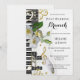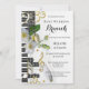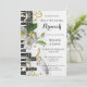 Invitación a un brunch o almuerzo boda con un diseño musical con guitarra, piano y notas musicales en oro y encantadoras rosas blancas recién hechas.