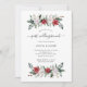 Esta sencilla y elegante invitación de brunch después de la boda presenta ramos de acuarela elegantes y modernos hechos de follaje verde y flores de Navidad rojas y blancas sobre un fondo blanco. La parte trasera de la invitación presenta una corona de Navidad elegante y a juego. Perfecto para una recepción después de la boda o un almuerzo de recién casados.
