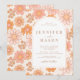 Elegante invitación a bodas con temática de marea de verano retro de primavera que exhibe delicadas flores de margarita en tonos rosa, naranja y amarillo, elegante y simple escritura de caligrafía en arco bohemio y monograma de novias y novias en la parte trasera.
