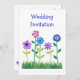 Una moda, invitación de boda moderna de Novia y Groom, con una hilera de flores rosas, azules y malvas, del collage de papel pintado a mano de "Flower Power" de Judy Adamson. Completa y fácilmente personalizable.