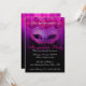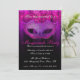 Invitación de celebración de fiesta de disfraces rosa y púrpura. Una invitación elegante y sofisticada que presenta una máscara de disfraces de tonos púrpura y rosa con florituras negras, un fondo de tonos púrpura/rosa con un patrón de damasco sutil que se superpone a un tipo negro y elegante que se puede personalizar para los detalles de su fiesta.