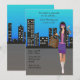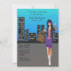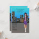 Una invitación "al día" que muestra un paisaje urbano como fondo y una linda joven cruzando la calle y sosteniendo una bolsa. Esta es una invitación maravillosa para una fiesta de cumpleaños de adolescentes, una despedida de soltera o una invitación para ir de compras.