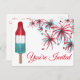 Tarjeta postal con ilustración original a marcador de una paleta de chupete de cohete roja, blanca y azul y una explosión de fuegos artificiales. Simplemente personalice el texto para una invitación única para una parrillada, picnic, fiesta o evento del 4 de julio.