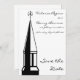 Una invitación de compromiso de boda con una ilustración gráfica en blanco y negro de un campanario y cruz de iglesia. La parte posterior presenta una iglesia simplificada.