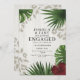 Celebre al futuro Sr. y Sra. con esta atrevida y hermosa invitación de compromiso tropical. Con hojas de palma verdes ricas, una llamativa flor de hibisco roja y suaves acentos de estampado de leopardo, es la combinación perfecta de exotismo y glamour moderno.