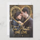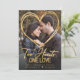 Cuando no tienes una fecha de boda, pero no puedes esperar a decirle a tu familia y amigos que estás comprometido, puedes agregar tus propias fotos y texto a esta moderna y elegante tarjeta de invitación de compromiso, para hacerles saber las buenas noticias, junto con la fecha y el lugar donde te comprometiste. Hay un overlay dorado de doble corazón en la foto, así como el texto de moda del guión dorado: "Two Hearts, One Love". La parte posterior de la tarjeta muestra una segunda foto. Si necesita ayuda para el diseño, o si desea combinar productos u otros colorantes, por favor contáctame a través de Zazzle.