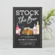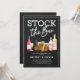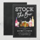 Invitaciones de compromiso de pareja para fiesta de regalos que presentan un fondo de pizarra, una selección de cervezas y vinos de acuarela, el dicho "abastecer el bar", y una plantilla de texto moderna que es fácil de personalizar.