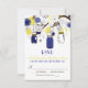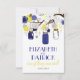 Ilustraciones caprichosas de frascos de Mason azules colgando de un árbol con cuerdas de corazón, dos pajaritos y una variedad de flores azules y verdes. Esta invitación de boda tiene artículos coincidentes. Esta invitación de frasco de Mason sería perfecta para bodas de primavera, invierno y al aire libre.