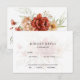 Un conjunto de invitaciones de boda elegantes que presentan flores de acuarela en tonos rústicos beige, naranja quemada y sienita sobre un fondo marrón.
