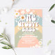 Celebra el gran hito de tu pequeño con esta invitación de primer cumpleaños con arcoíris pastel retro. Con fuentes inspiradas en los 70, margaritas alegres, mariposas, signos de paz y arcos coloridos, este diseño trae paz, amor y diversión a los detalles de tu fiesta. Perfecto para celebraciones boho, retro o hippies, esta invitación personalizable establece el tono para una reunión de cumpleaños alegre y elegante.