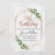 Foliage, flauta rosa dorada y mármol invitación para 30 años. Este diseño presenta una caligrafía de pincel en un falso Relieve metalizado de oro rosa que no puede ser alterado y un poco de follaje verde. El fondo es una imagen de mármol blanco. Esta invitación de Marbel y Faux rosa dorado art 30 cumpleaños es fácil y listo para ser personalizado.