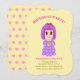 Invitación de cumpleaños 4 de niña con una linda niña vestida de violeta y tréboles de cuatro hojas en la parte posterior. Todos los textos y números están listos para ser personalizados.