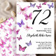 Esta bonito y caprichosa invitación de cumpleaños número 72 es perfecta para un buen fiesta y le dará un tono divertido y festivo. Este diseño presenta mariposas rosas y púrpura, y es una buena elección femenina para un evento especial para celebrar un cumpleaños histórico. Personalizar para tu año de cumpleaños, y busca "72" en mi tienda para ver diseños coordinados.
