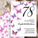 Esta bonito y caprichosa invitación de cumpleaños 78 es perfecta para un buen fiesta y le dará un tono divertido y festivo. Este diseño presenta mariposas rosas y púrpura, y es una buena elección femenina para un evento especial para celebrar un cumpleaños histórico. Personalizar para tu año de cumpleaños, y busca el "78" en mi tienda para ver diseños coordinados.