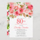 Rosas, peonías y margaritas crean un diseño floral de verano rosa bonito. Las barras y el follaje le dan un toque rústico. 80 está escrito en un gran texto en negrita. Puede cambiarse por cualquier año que desee. El nombre del celebrante de cumpleaños está escrito en un elegante tipo de letra. La parte trasera de la invitación es una estampación floral blanca y rosa.