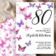 Esta bonito y caprichosa invitación de cumpleaños número 80 es perfecta para un buen fiesta y le dará un tono divertido y festivo. Este diseño presenta mariposas rosas y púrpura, y es una buena elección femenina para un evento especial para celebrar un cumpleaños histórico. Personalizar para tu año de cumpleaños, y busca "80" en mi tienda para ver diseños coordinados.