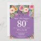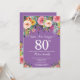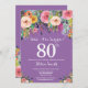 Invitación de cumpleaños 80 a mujeres con sorpresas florales púrpura. Flor floral acuarela. Fondo violeta de la Lavanda Lilac Púrpura. Rosa, Amarillo, Naranja, Flor Púrpura. Cumpleaños de adultos. 13. 15. 16. 18. 20. 21. 30. 40. 50. 60. 70. 80. 90. 100. Cualquier edad.