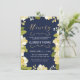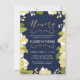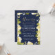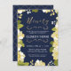 Esta moderna y bonito invitación para el cumpleaños número noventa presenta un borde floral ilustrado y la palabra "noventa" en oro (Relieve metalizado de oro simulado). El fondo es de color azul marino, pero se puede personalizar según el color que elija. La parte posterior de la invitación incluye un patrón de quatrefoil dorado con un fondo azul que también se puede intercambiar. El texto es el personalizable para la celebración especial del 90 cumpleaños.