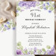 Esta elegante invitación de cumpleaños 91 con borde floral en marfil, lavanda púrpura y verde salvia es perfecta para una fiesta de cumpleaños elegante. Este diseño presenta un marco de flores de acuarela y es una buena opción femenina para un evento especial para celebrar un cumpleaños importante.