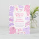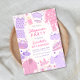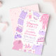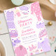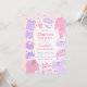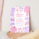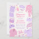 Invite a sus huéspedes a su fiesta con nuestra invitación de cumpleaños Sleepover. Diseño rosa y morado con pijamas, máscaras para dormir, zapatillas, pizza, palomitas de maíz, esmalte de uñas y elementos más divertidos de fiesta PJ.