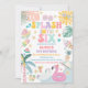 Crea un impacto con esta colorida invitación de cumpleaños para fiesta en la piscina, perfecta para celebrar el día especial de tu hijo. Con ilustraciones veraniegas vibrantes como paletas, flotadores de flamenco, palmeras y sandías, este diseño divertido establece el tono para una celebración llena de diversión. Ideal para cumpleaños de niños, fiestas de natación o eventos con tema tropical, esta invitación personalizable hace que la planificación sea fácil y memorable. Personaliza con los detalles de tu fiesta para crear un recuerdo único que tus invitados amarán.