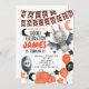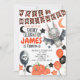 Invitación al cumpleaños de Halloween Bat Pumpkin Invitación a la fiesta para celebrar tu cumpleaños de Halloween. Invite a la gente a su fiesta con este diseño increíble. El gato lindo que sale de la calabaza con pancarta de halloween, lunas y murciélagos es una gran combinación para los niños cumpleaños!
