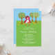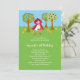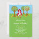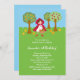 Una invitación alegre y colorida basada en el libro de cuentos Little Red Riding Hood. Cuenta con una feliz Caperucita Roja en el bosque con árboles y flores alrededor y un cielo azul. Genial por un cumpleaños de chica. Invitación de moda y atractiva.