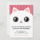 Invitación de cumpleaños para niños con una cara de gatito blanco adorable con grandes ojos brillantes redondos. El fondo está rayado. Fácil de personalizar ya que está diseñado como plantilla.