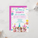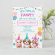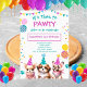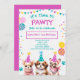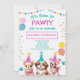Los adorables chicas "nos dejamos trapear" adorables invitaciones para el cumpleaños del cachorro. Los colores son vivos, con globos verde azulados y rosados y coloridos.