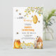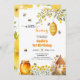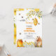 Un dulce tema de cumpleaños con abejas, tarro de miel, colmena y flores amarillas en la parte delantera y trasera. Puede personalizar esta invitación con sus propios detalles.