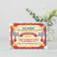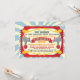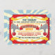 Encantadoras invitaciones a la fiesta de cumpleaños de Circo o Carnaval con elefantes y monos tocando un cartel para darle la bienvenida al fiesta. Con forma de boleto vintage a una actuación con fondo de ráfaga de sol. Ilustracion dibujado a mano por McBooboo.