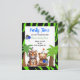 Esta encantadora invitación de cumpleaños temática de la jungla cuenta con un adorable tigre bebé y oso vistiendo vibrantes gorras fiestas. Las palmeras se deslizan en el fondo, enmarcadas por un borde impreso verde y negro, con globos coloridos esparcidos por todo el mundo para una celebración festiva de los animales del zoológico.